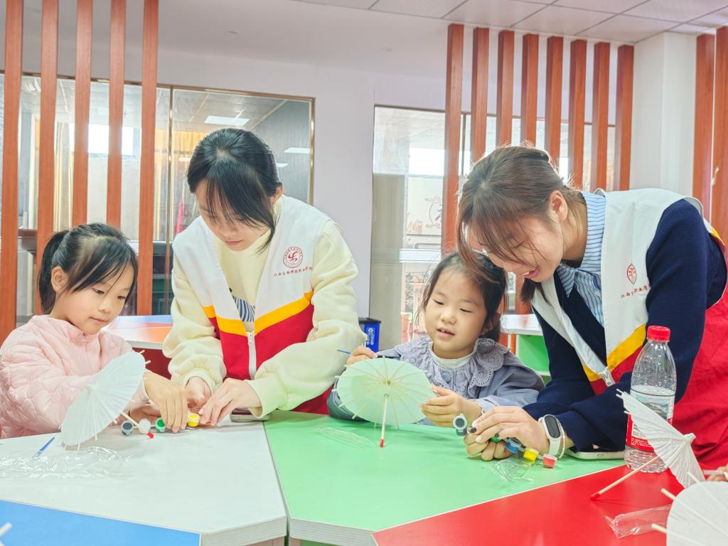 活动中,志愿者们精心设计了剪纸、泥塑、传统绘画等非遗体验内容。非遗社成员现场讲解并演示制作技巧,孩子们在志愿者的耐心辅导下,亲手体验油纸伞绘制等传统工艺。课堂气氛活跃,孩子们在动手实践中感受传统文化的魅力,增强了文化认同与创造力。孩子们自豪地展示自己的作品,并分享参与感受。